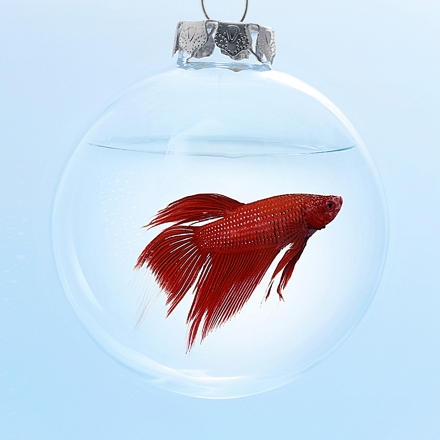 For the 2012 card Stephen started with an almost complete stock image of a goldfish in a Christmas tree bauble. He removed the distracting internal wires and shifted the gold lid to silver.