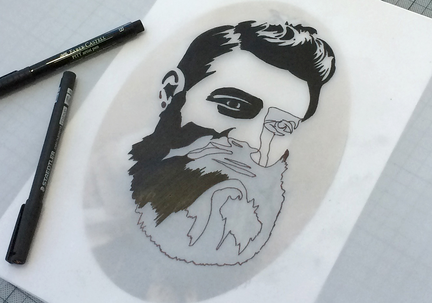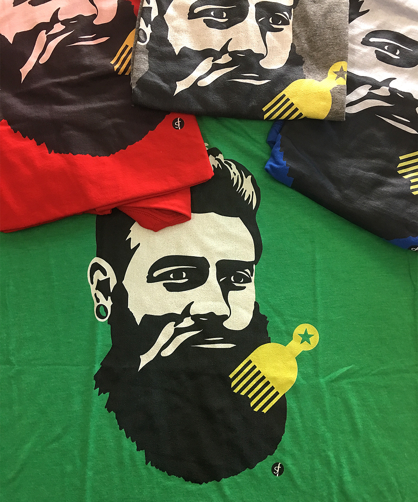 This design takes its inspiration from both the Blaxploitation poster art of the 70’s, and the iconic image of Che Guevara from 1960. I illustrated the shadow areas and took the design into illustrator to be reworked, exaggerating the beard slightly and adding an ear ring tunnel. The final piece used a superfly afro pick style. Part of the ‘Beardy Man’ design collection.