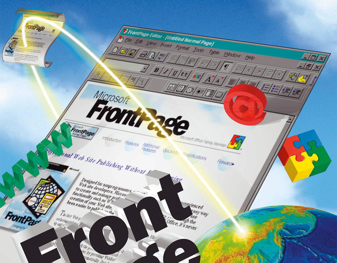 Front cover image for the Microsoft Communiqué magazine featuring the new Microsoft Front Page application. Utilising Alias Sketch 3D software to set the lighting and texturing of the composition of the image, and Photoshop for the final shading and colour balance.