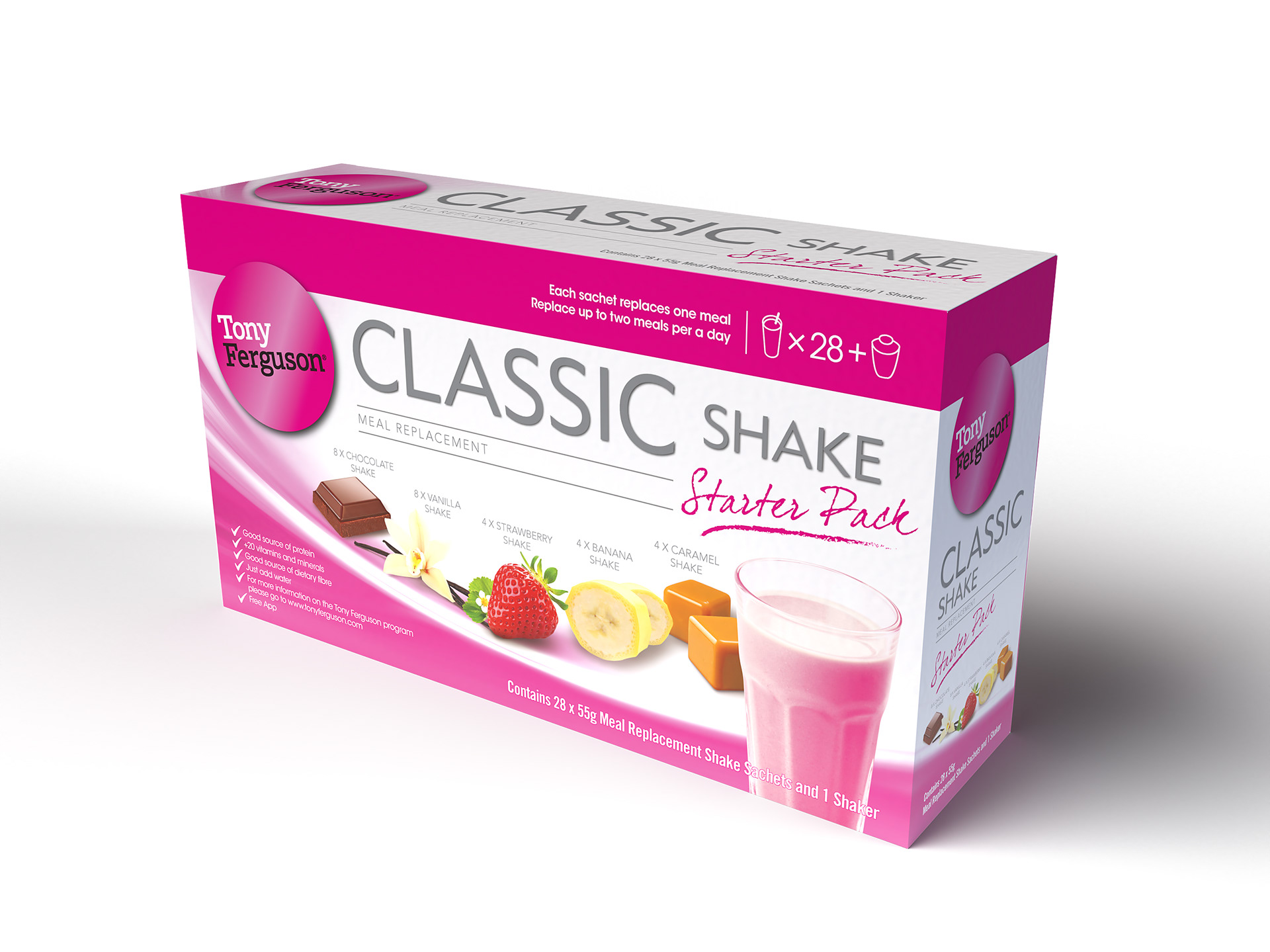Initial concepts for this project were for a Tony Ferguson 'Original Shake' range of up to eight SKUs. The scope was reduced to a single starter kit containing five shake flavours under the new 'Classic Shake' moniker. Stephen had to adapt the approved front-of-pack design for the Strawberry variant and move it over to the more oversized format carton required for the job. Franklin adjusted the background swirl colour to the primary Tony Ferguson Pink. And he expanded the range of cameo images used to cover the flavours included in the pack. The result was a strongly branded Tony Ferguson product that was true to the original intent of the approved design.